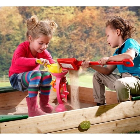 Piękna i wszechstronna, drewniana piaskownica AXI to doskonałe dopełnienie przydomowego placu zabaw. Piaskownica została wyposażona w schowek na akcesoria, w którym dzieci mogą przechowywać swoje łopatki i wiaderka. Schowek posiada drewniane pokrywy, które pełnią funkcję ławki. Na każdym narożniku znajdują się wygodne siedziska. Do zestawu została dołączona plandeka, która pełni funkcję pokrywy oraz specjalne podłoże przeciw chwastom. W piaskownicy zmieści się nawet 350kg piasku! Całość jest łatwa w montażu.