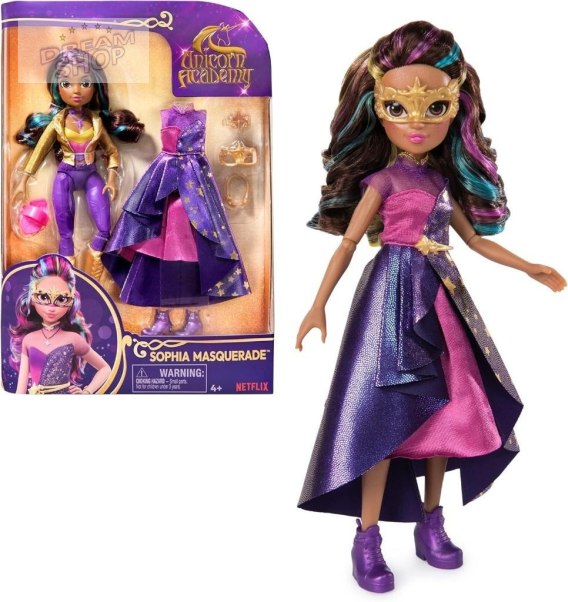 Świętuj magię Wróżek Losu na balu maskowym Akademii Jednorożców z lalką Sophia Masquerade! Zainspirowana serialem animowanym NETFLIX i bestsellerowymi książkami, ta 23 cm lalka z akcesoriami ożywia postać Sophii. Sophia, oddana z dużą dbałością o detale i wyposażona w 9 akcesoriów dla lalek, ma na sobie strój jeździecki i jest gotowa na przygodę ze swoim jednorożcem, interaktywną Gwiazdą (sprzedawanym oddzielnie)! Gdy nadejdzie czas balu, przebierz Sophię, aby zamiast zdejmowanej kurtki, naszyjnika i butów miała na sobie asymetryczną sukienkę w gwiazdki, pasek, maskę i fioletowe botki. Upnij jej rozjaśnione włosy za pomocą narzędzia do włosów i spinki. Dzięki 9 punktom zgięcia możesz pozować Sophię, odtwarzając sceny z serialu! Aby uzyskać więcej sposobów na poznanie Akademii Jednorożców z ulubionymi postaciami, poszukaj lalek Isabel i Avy oraz ich jednorożców, Wirka i Listki (każdy sprzedawany osobno) i rozbuduj świat znany z książek i serialu! Magiczne więzi między uczniami Akademii Jednorożców i ich wierzchowcami pobudzą wyobraźnię do tworzenia niekończących się historii. Zabawki z serii Akademia Jednorożców to wspaniałe prezenty świąteczne lub okolicznościowe dla dzieci, które lubią zabawkowe jednorożce i konie, lalki i akcesoria, domki dla lalek, przedmioty kolekcjonerskie, pluszaki i nie tylko. Zabierz do domu luksusową lalkę Sophia Masquerade z serii Akademia Jednorożców!