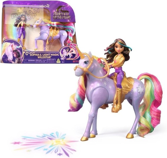 Doświadcz magii Akademii Jednorożców z Sophią i Magią Światła Gwiazdy! Ten duet, zainspirowany serialem animowanym NETFLIX i bestsellerową serią książek o przyjaźni, celebruje wyjątkową więź między jeźdźcem a jednorożcem. Dzięki wiernie odwzorowanym detalom, miękkiej tęczowej grzywie i ogonowi, a także prawdziwym efektom świetlnym Gwiazdy, zestaw ten pobudzi magię wyobraźni. Dzięki 7 punktom zgięcia możesz ustawić Sophię tak, by dosiadła Gwiazdy i nacisnąć przycisk z gwiazdką na boku jednorożca, by włączyć światła (w zestawie 3 baterie LR44) i odtworzyć ulubione sceny. Gwiazda tupie kopytem, używając swojej Magii Światła, aby wyświetlić tęczowy wzór, tak jak w serialu! Sophia bezpiecznie trzyma się na Gwiazdy dzięki zdejmowanej uździe i akcesoriom do siodła. Aby uzyskać więcej sposobów na poznanie Akademii Jednorożców z ulubionymi postaciami, poszukaj innych małych lalek, w tym Avy, Layli, Isabel, Valentiny i ich jednorożców (zestawy sprzedawane osobno) aby rozbudować świat znany z ksiązek i serialu! Zabawki z serii Akademia Jednorożców to wspaniałe prezenty świąteczne lub okolicznościowe dla dzieci, które lubią zabawkowe jednorożce i konie, lalki i akcesoria, domki dla lalek, przedmioty kolekcjonerskie, pluszaki i nie tylko. Zabłyśnij w swoich przygodach w Akademii Jednorożca z Sophią i Magią Światła Gwiazdy!