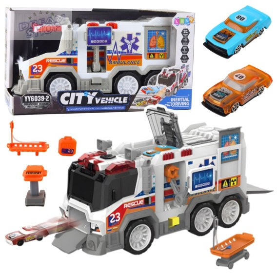 Karetka ma otwierane drzwi i klapy, a wewnątrz znajduje się przestrzeń do zabawy, w której można umieścić drobne akcesoria medyczne lub figurki. Ruchome elementy umożliwiają odgrywanie scen akcji ratunkowych, rozwijając wyobraźnię i zdolności manualne dziecka.