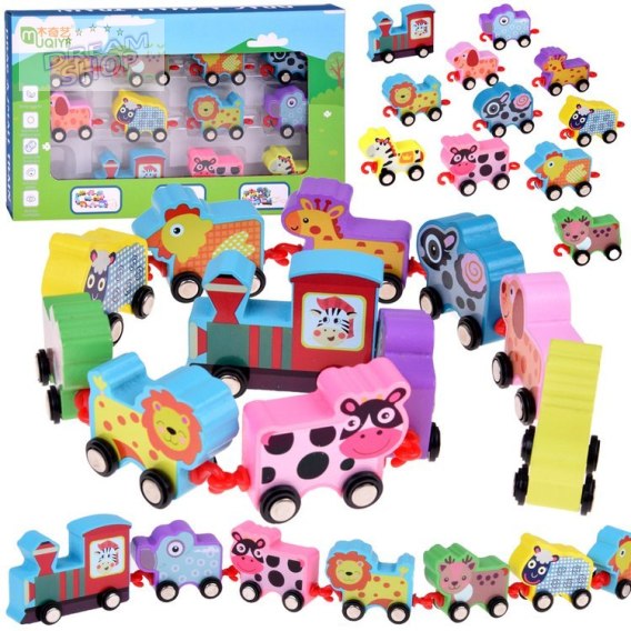Zabawka wykonana z drewna, z plastikowymi kółkami i zaczepami. Kolorystyka i grafika wagonów jest bardzo atrakcyjna i zachęci każde dziecko do zabawy.