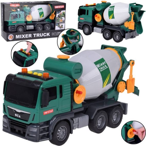 Najważniejsze funkcje zabawki: Efekty dźwiękowe: realistyczne odgłosy pracy maszyny. Ruchome elementy: obracający się bęben (za pomocą korbki) i otwierany lejek do wysypywania "betonu". Solidne wykonanie: wysoka jakość materiałów zapewnia trwałość i bezpieczeństwo. Realistyczny design: detale nawiązujące do prawdziwych pojazdów budowlanych. Napęd i opony: gumowe koła oraz napęd na przednie koła zapewniają płynną jazdę oraz zapobiegają rysowaniu się podłogi.