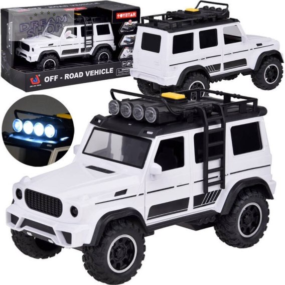 Autko terenowe przeznaczone do zabawy dla każdego małego kierowcy. Autko wykonane bardzo starannie i efektownie. Karoseria pojazdu wykonana z tworzywa sztucznego w kolorze bieli świetnie się reprezentuje. Na dachu znajduje się bagażnik oraz duże światła oświetlające przestrzeń przed pojazdem. Samochód posiada otwierane przednie drzwi, efekty dźwiękowe oraz migające światła na dachu pojazdu.