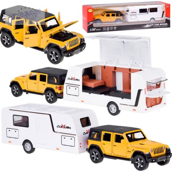 W zestawie znajdziesz: - terenowy samochód - przyczepa kampingowa - zapasowe zaczepy do przyczepy