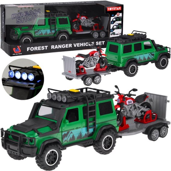 Zestaw - interaktywne autko, pojazd terenowy, przyczepa, przyczepka, laweta, w zestawie z motorem, motor, motocykl, efekty świetlne i dźwiękowe, gumowe koła