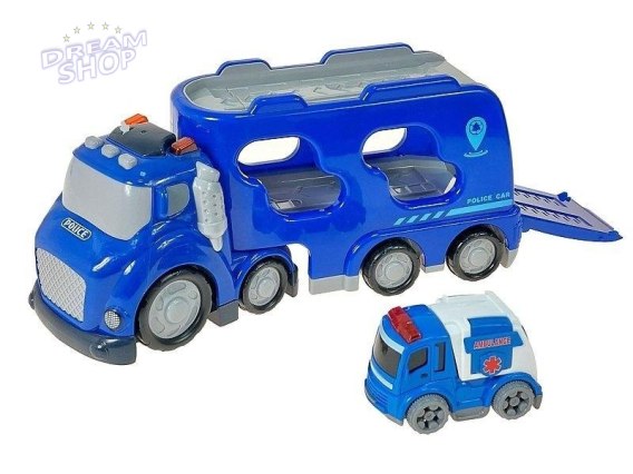auto z kontenerem i autem policyjnym, światło, dźwięk; 30x10,5x16cm, W/B