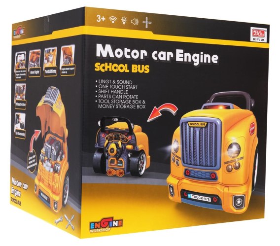 Interaktywna zabawka, przód żółtego autobusu szkolnego z podnoszoną maską oraz deską rozdzielcząprzeznaczony dla dzieci od 3-go roku życia. Komplet zawiera części do złożenia przodu autobusu oraz narzędzia potrzebne w montażu i demontażu części takie jak śrubokręt, czy klucze. Pod maską autobusu znajduje się duży rozkręcany silnik, który dziecko może rozłożyć na czynniki pierwsze. Do wymiany nadają się także świece zapłonowe oraz koła. Na desce rozdzielczej znajduje się przycisk startu pojazdu z odgłosami zapalania silnika, kierownica z klaksonem oraz sygnalizator awaryjny. Pod kierownicą umiejscowiony jest schowek, do którego można włożyć wszystkie niezbędne narzędzia, śruby, pokrętła. Zabawka posiada wygodną rączkę do przenoszenia. Zasilanie bateriami typu 3 x AA 1,5 V (brak w zestawie). Zabawka dla małego mechanika rozwija umiejętności manualne, małą motorykę oraz koordynację oko-ręka.