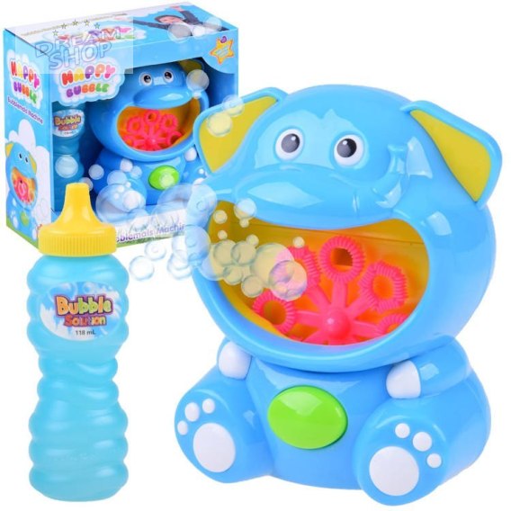 Bańki mydlane to ulubiona zabawa małych i dużych dzieci. Rewelacyjna maszynka do robienia baniek mydlanych w kształcie słonika zapewni mnóstwo radości każdemu dziecku. Zabawka pozwala na puszczanie kolorowych baniek z automatu. Wystarczy nalać płyn do otworu, w którym znajduje się tarcza z oczkami, włączyć przycisk znajdujący się na brzuszku słonia, który uruchomi wiatraczek, obrót tarczy i gotowe. Zabawka podczas kręcenia się tarczy wypuszcza magiczne, tęczowe bańki.
