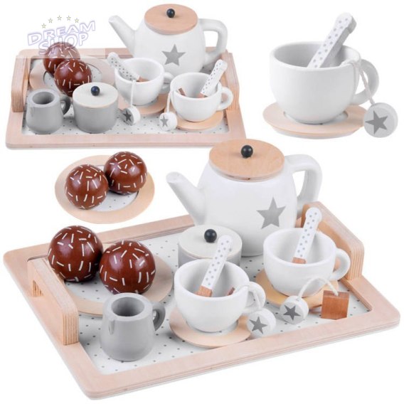 Uroczy zestaw herbacianyw kolorach beżu, wykonany w całości z drewna - zapewni wspaniałą zabawę każdemu dziecku, które będzie chciało "wypić herbatkę".