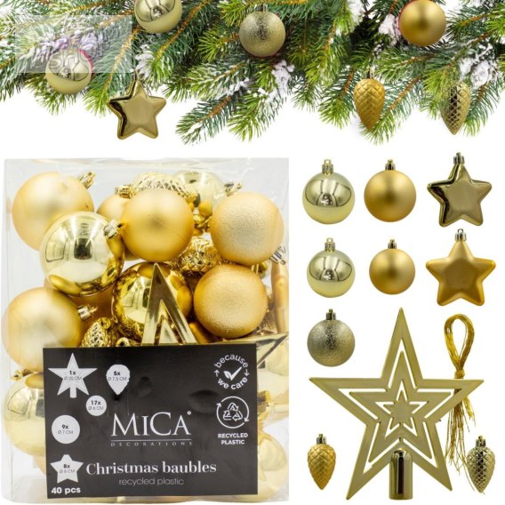 W zestawie: - czubek gwiazda - 1szt, bombka/szyszka - 5szt/7,5cm, bombka o średnicy 6cm- 17szt., bombka o średnicy 8cm - 8szt., bombka o średnicy 7 cm - 9 szt., bombka gwiazdka o średnicy 8 cm -8szt.