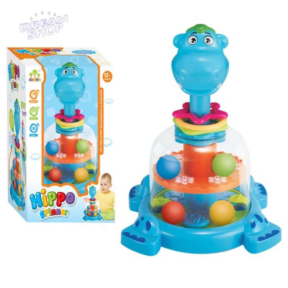Ta niesamowita zabawka bączek w kształcie hipopotama zapewni Twojemu maluchowi mnóstwo radości. Po naciśnięciu głowy hipcia, koło w brzuszku się obraca, a kuleczki podskakują.