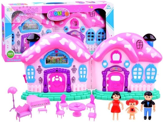 Uroczy, rozkładany domek do zabawy w rodzinę sprawi mnóstwo radości każdemu dziecku. Domek muchomorek, ślicznie ozdobiony z uroczymi detalami, może stać się centrum świetnych zabaw. W domku mieszka rodzina mama, tata i córeczka. Ale to gospodarz decyduje kto w tym domku będzie mieszkał i mogą to być pet shopy, Lalaloopsy, kucyki pony...na co komu przyjdzie ochota. Domek wyposażony jest w mebelki, pomieści mnóstwo gości. Dodatkową atrakcją domku jest efekt dźwiękowy szczekający pies, wesoła melodia,efekty świetlne, podczas którego na telebimie przesuwa się obraz z życiem rodzinnym, zabawa na placu zabaw.