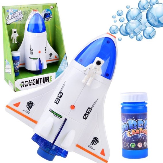 Bańki mydlane to ulubiona zabawa małych i dużych dzieci. Rewelacyjna maszynka do robienia baniek mydlanych w kształcie Rakiety na pewno zapewni mnóstwo radości każdemu dziecku. Każdy maluch marzy, aby znaleźć się na pokładzie tej niezwykłej maszyny i poczuć się jak prawdziwy astronauta. To świetny gadżet dla małych astronautów. Zabawka pozwala na puszczanie kolorowych baniek z automatu. Wystarczy tylko wkręcić buteleczkę z płynem do spodu rakiety, włączyć przycisk znajdujący się na grzbiecie uruchamiając obrót tarczy, który podczas pracy wypuszcza magiczne, tęczowe bańki. Dzięki zamontowanym kółkom rakieta będzie mogła poruszać się po podłożu, a z przodu rakiety wydmuchiwane będą bańki. Całej zabawie będzie towarzyszył odgłos startu rakiety oraz światełko umieszczone w podstawie kosmicznego pojazdu. Oczywiście w rakiecie nie może zabraknąć astronauty w białym kombinezonie. Astronauta ma swoje miejsce na kokpicie, można go umieścić i wybrać się w kosmos!