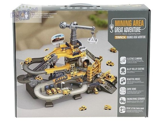 baza załadunkowa węgla, tor 3 poziomowy, dźwig, pojazdy budowlane; 42x34x13cm