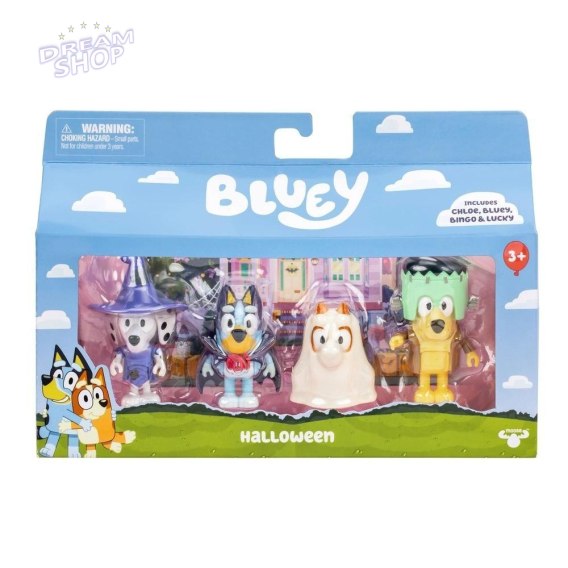 Bluey i Bingo przygotowują się do balu ze swoimi przyjaciółmi Chloe i Luckym świetnie się bawią strasząc innych. Każda figurka posiada ruchome ramiona i nogi. Ich wielkość jest idealna dla przedszkolaków.