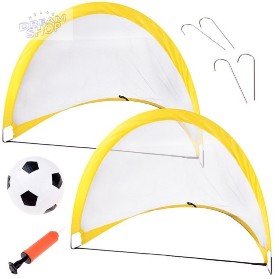Świetny zestaw dla młodego sportowca do gry w piłkę nożną. Zestaw składa się z 2 elastycznych, bramek piłkarskich samorozkładających się w żółtym kolorze z czarną siatką.
