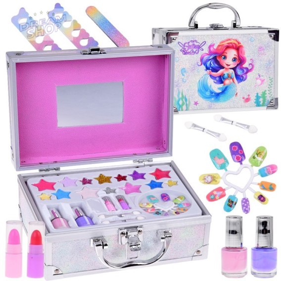 Kosmetyki dla dzieci, cienie do malowania powiek, szminka, lakier do paznokci, lakiery, paznokcie, tipsy, naklejki na paznokcie, pilnik do paznokci, brokatowy kuferek, syrenkowy kuferek, syrenka, syrena, magiczny kuferek z lusterkiem, lusterko