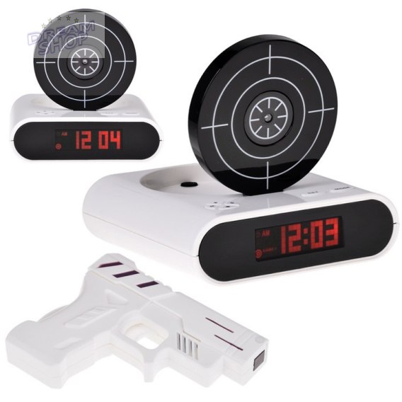 Jeśli wstawanie rano to dla ciebie zmora jak z resztą dla większości ludzkości to budzik z pistoletem może okazać się świetnym pomysłem. Ileż to razy rzucałeś w budzik czym popadnie, zrzucałeś go z półki? na pewno mnóstwo razy. Dlatego budzik z pistoletem to istny strzał w dziesiątkę. Wystarczy wycelować pistoletem w tarczę i budzik przestaje nas budzić! Strzelanie do budzika będzie bardzo przyjemne i nigdy Ci się nie znudzi, bo możesz sam nagrywać dźwięki alarmu. Wystarczy wybrać melodię lub odgłos, które są dla Ciebie wyjątkowo irytujące lub przyjemne, a pobudka będzie z pewnością skuteczna! Tak wiem, wiąże się to ze spóźnieniem do szkoły, pracy....albo czasami po prostu z dłuższą drzemką. Oprócz tego iż zegar jest budzikiem, w wolnym czasie można sobie po prostu do niego postrzelać