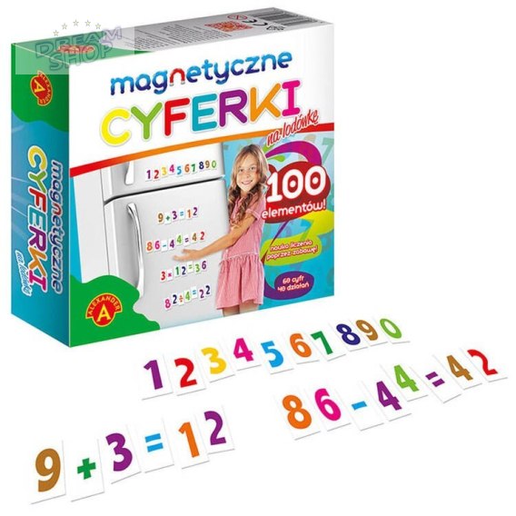 Magnetyczne kolorowe cyferki na lodówkę, pralkę, okap lub na każdą inną metalową powierzchnię. W komplecie znajduje się aż 100 elementów, z których można układać dowolne działania. Z pomocą cyfr i znaków znajdujących się w zestawie nauka podstawowych działań matematycznych stanie się przyjemną zabawą dla dziecka.