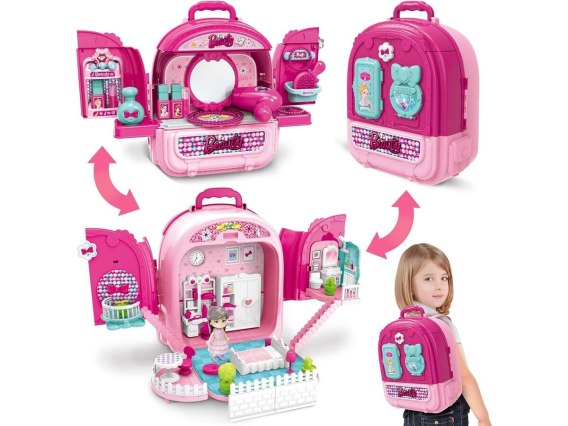 Plecak otwierany jest z dwóch stron. Każda z nich kryje w sobie inne możliwości zabawy. Jedna to mini toaletka z lusterkiem, kosmetykami, biżuterią oraz suszarką do włosów. Druga strona to uroczy domek dla lalek z sypialnią, tarasem oraz wyposażoną łazienką.