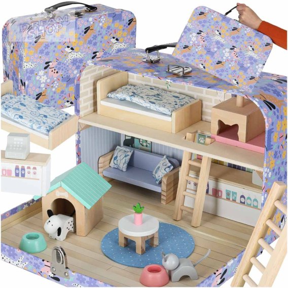 Domek w walizce hotel spa dla zwierząt drewniane mebelki figurki
