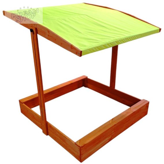 Drewniana piaskownica z daszkiem chroniącym dziecko przed słońcem, który można po zakończonej zabawie można opuścić, aby chronił piasek przed zwierzętami, liśćmi itp. Piaskownica wykonana jest z drewna świerkowego lub sosnowego, impregnowana ekologicznym impregnatem wodnym. Daszek pokryty jest wytrzymałą tkaniną poliestrową. Daszek jest regulowany- zarówno jego wysokość jak i pochylenie. Dno z agrowłókniny zapobiega wymieszaniu piasku z podłożem oraz wyrastaniu trawy jednocześnie w naturalny sposób przepuszczając wodę i powietrze.
