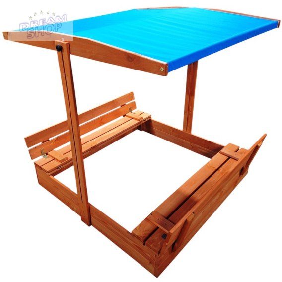 Drewniana piaskownica z daszkiem chroniącym dziecko przed słońcem, który można po zakończonej zabawie można opuścić, aby chronił piasek przed zwierzętami, liśćmi itp. Piaskownica wykonana jest z drewna świerkowego, impregnowana ekologicznym impregnatem wodnym. Po otwarciu piaskownicy powstają dwie wygodne ławeczki, dzięki czemu maluch będzie mógł wygodnie usiąść podczas zabawy lub odłożyć na bok butelkę z napojem.