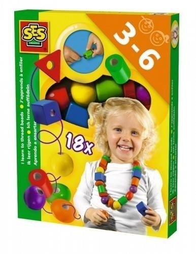 Zestaw do nawlekania korali. Zabawka dla najmłodszych, doskonała do poznawania kolorów, kształtów oraz ćwiczenia koordynacji podczas świetnej zabawy. Zestaw zawiera 18 dużych korali o różnych kształtach i kolorach. Dla dzieci od 3 roku. Wyprodukowano w Holandii.