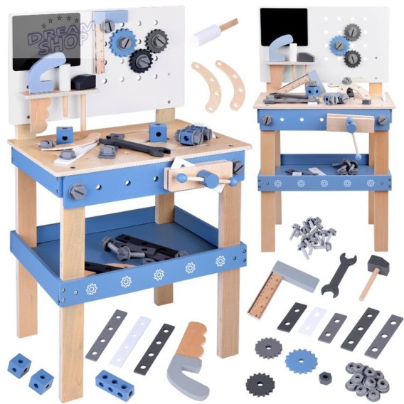 Ten drewniany warsztat to idealna zabawka edukacyjna dla małych majsterkowiczów. Zestaw został zaprojektowany z myślą o rozwijaniu umiejętności manualnych oraz wyobraźni u dzieci, a także wprowadzaniu ich w świat narzędzi i majsterkowania. Wykonany z solidnego drewna, warsztat jest trwały, bezpieczny i estetyczny, a jego naturalne kolory w połączeniu z niebieskimi akcentami przyciągną uwagę każdego dziecka.