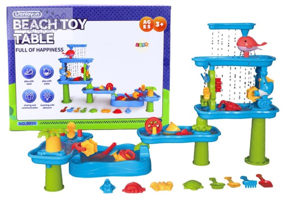 Plac zabaw stolik wodny to idealna zabawa na świeżym powietrzu, w ogrodzie lub na plaży. Zestaw zawiera młynki, grabki, łopatki, konewki, foremki i inne akcesoria do zabawy z wodą i piaskiem, wspierając kreatywność, rozwój i naukę przez zabawę.