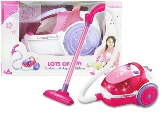 Prezentowany odkurzacz posiada włącznik, po którego wciśnięciu słychać realistyczne dźwięki pracy silnika, czemu towarzyszy kolorowa, świecąca się lampka. Odkurzacz osadzony jest na kółeczkach, dzięki czemu dziecko może przemieszczać się z nim po domu, a także elastyczną, białą rurkę, przeźroczystą, sztywną końcówkę i szczotkę w kształcie trójkąta. Elementy te sprawią, że dziecko będzie mogło dotrzeć z odkurzaczem nawet do najmniejszego zakamarka.