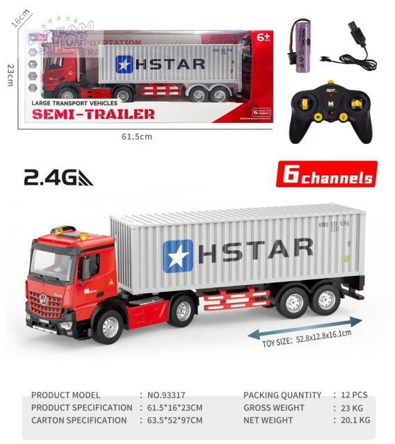 Zdalnie sterowana ciężarówka z kontenerem dla dzieci od szóstego roku życia. Kontener możemy odczepić od pojazdu i bawić się samą ciężarówką. Pojazd posiada gumowe opony, dobrze trzymające się podłoża, na dachu ciężarówki i w jej przedniej części, świecą się światełka. Pojazd sterowany jest pilotem, jeździ do przodu, tyłu, skręca w lewo i prawo. Z pilota możemy również włączać i wyłączać oświetlenie i odgłosy. Zabawka zasilana jest akumulatorem typu 3,7V(w zestawie), pilot bateriami typu 2 x AA 1,5V (brak w zestawie).