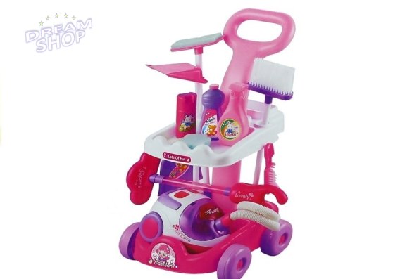 Ten 14-elementowy zestaw sprzątający wyposażony jest w odkurzacz, który podczas zabawy wydaje realistyczne dźwięki, zasysając kuleczki imitujące śmieci. Trafiają one do przeźroczystego pojemniczka, w którym zabawnie wirują, jednak mogą być ponownie użyte. Dziecięcy odkurzacz wyposażony jest we włącznik ON/OFF oraz lampkę sygnalizującą zasilanie, a także giętką rurę, przyssawkę oraz poręczny uchwyt, który może ułatwić dziecku przenoszenie sprzętu.