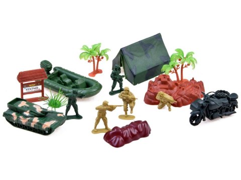 Zestaw zawiera: - wóz bojowy - 2 x samochód wojskowy - 3 x czołg - 2 x pontony wojskowy - 3 x pojazdy bojowe na gąsienicach - 6 x helikopter - 2 motor - laweta - 4 x namioty wojskowe - 2 x schron - 2 x wieże obronne - pagórki - zasieki - murki obronne - skrzynia amunicji - skrzynie z granatami - skrzynie z bombami - barykady - elementy budynków - działo przeciw lotnicze - spychacz wojskowy - znaki drogowe - znaki ostrzegawcze - znaki informacyjne - flaga - beczki z paliwem - druty kolczaste/zagrody/zasieki - drzewa, trawy, elementy kamuflażu - broń/karabiny maszynowe - żołnierze - psy - elementy z radiostacją Przykładowy wymiar: