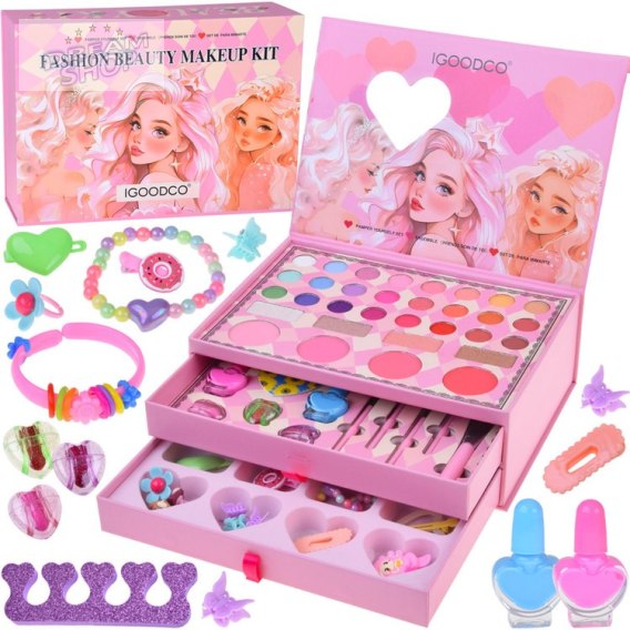 Ta szkatułka to prawdziwy skarb, w którym kryją się wszystkie najpiękniejsze akcesoria potrzebne do zabawy w makijaż, stylizację paznokci oraz tworzenie bajkowych fryzur. Jej pastelowa kolorystyka w odcieniach różu i delikatnych barw sprawia, że całość wygląda niezwykle dziewczęco, elegancko i słodko - idealnie dla małych księżniczek, które uwielbiają błysk i uroczą zabawę.