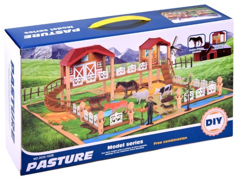 Duży zestaw farma 2 w 1 to świetny pomysł na pokazanie naszym pociechom jak wygląda życie na wsi! Zestaw posiada wiele możliwości można go rozbudować na dwa różne sposoby, tworząc duże pole dla kreatywności Twojego dziecka. Maluch będzie mógł wcielić się w rolę farmera i poczuć się jak prawdziwy właściciel gospodarstwa. Duża papierowa plansza imitująca trawę, ścieżkę oraz jeziorko to teren Twojej działki możesz zbudować na niej dużą stajnię jak również zagrodę dla swoich zwierząt, aby nie uciekły. Świetnym dodatkiem są światełka, które wieczorem oświetlą farmę, aby zwierzęta czuły się bezpiecznie. Dzięki tej zabawce dziecko rozwinie, wyobraźnie, sprawność manualną oraz koordynację ręka-oko. To świetna zabawa do której dołączyć może cała rodzina i przyjaciele! Na farmie mnóstwo się dzieje, trzeba zająć się gospodarką, nakarmić zwierzaki: krówkę, konia, kaczkę oraz kotka. Za pomocą tego zestawu dziecko może lepiej poznać realia życia na wsi.