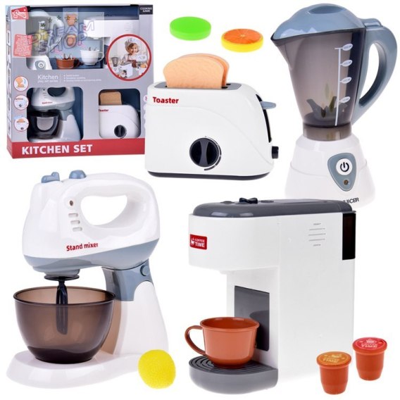Co zawiera zestaw? - mikser- robot planetarny z trzema różnymi końcówkami - ekspres do kawy - 2 filiżanki - 2 kapsułki - toster - blender kielichowy - owoce (cytryna, plaster pomarańczy- atrapy) Uwaga! Produkty nie nadają się do spożycia!