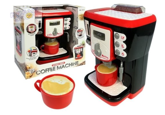 Czarno-Czerwony ekspres do kawy to naprawdę ciekawa zabawka. Z wyglądu stylizowana jest na nowoczesne automaty, dzięki czemu śmiało może stać w kuchni koło swojego oryginału. Zabawka wyposażona jest w pokrętło służące do przełączania typów przygotowywanej kawy - Cappuccino, Latte i Macchiato. Z lewej strony urządzenia znajduje się zbiornik, który po przełączeniu przycisku sprawia, że z dozownika zaczyna płynąć woda! Z prawej strony z kolei znajdują się przyciski symulujące różne tryby pracy ekspresu. Zestaw wyposażony jest również w imitację ziarenek kawy w zbiorniczku oraz w filiżankę, która może być napełniana przez ekspres.