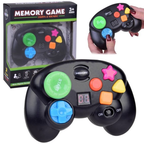 Gra pamięciowa MEMORY to popularna gra, która ćwiczy pamięć poprzez słuchanie i koncentrację wzrokowo-ruchową. Grę przedstawiamy w nowoczesnej elektronicznej formie o oryginalnym kształcie Pada. Umiejscowienie przycisków, odpowiada prawdziwej konsoli, dzięki czemu zabawka wygląda bardziej realistycznie. Gra polega nazapamiętywaniu sekwencji dźwiękowych i świetlnych odtwarzanych przez zabawkę i dokładnym ich powtórzeniu. Sekwencja po każdym poprawnym wyborze wydłuża się i grający przechodzi na kolejne, wyższe poziomy. Pad posiada wbudowany cyfrowy ekran z licznikiem, który pokaże do jakiego poziomu udało ci się dotrzeć. Jeżeli osiągniesz poziom 5, 10, itp. otrzymasz brawa i owacje.
