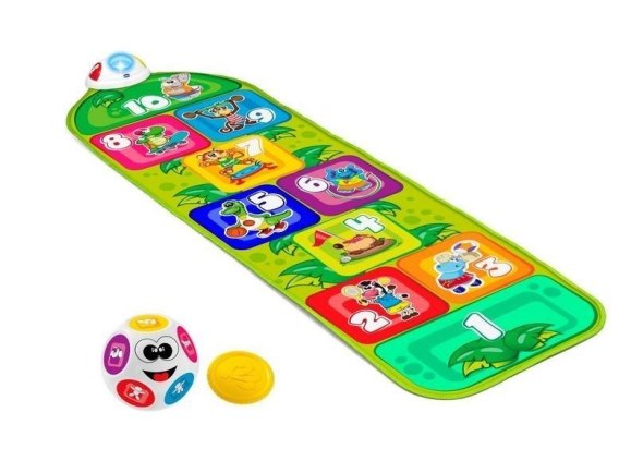 Elektroniczna mata z 10 polami, na które trzeba wskoczyć i uroczymi zwierzętami, z którymi zabawa daje wiele radości.