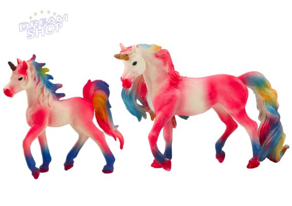 Figurki różowych jednorożców, dorosłego z małym, mają realistyczne faktury, kolorowe grzywy i ogony. Wykonane z solidnego, trwałego materiału, rozwijają wyobraźnię dzieci. Idealne do zabawy, edukacji oraz jako ozdoba pokoju czy element kolekcji.