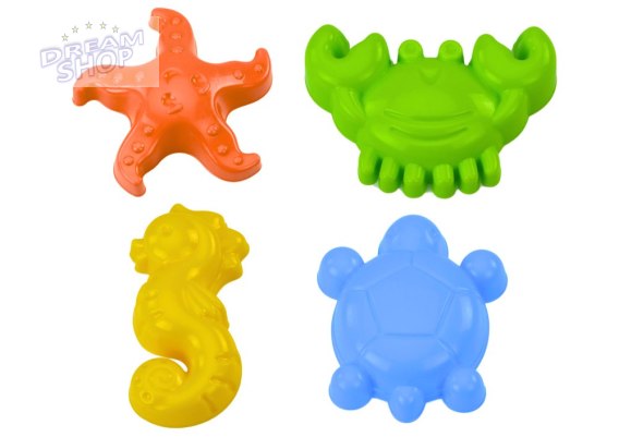 Zestaw foremek do piasku dla dzieci z czterema kolorowymi foremkami: zielony konik wodny, niebieski żółw, pomarańczowa rozgwiazda i żółty krab. Wykonane z solidnego plastiku.
