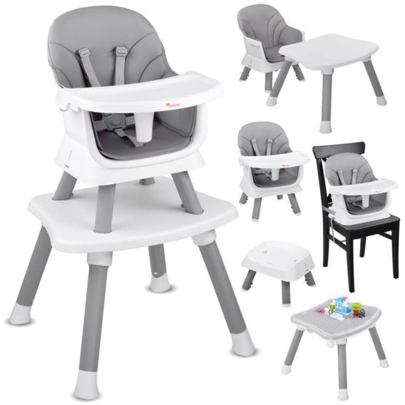 Fotelik krzesełko do karmienia to zestaw 6w1 idealny dla dzieci już od 6 m-ca, które zaczęły samodzielnie siedzieć. Modułowy mebel w nowoczesnym stylu, będzie pasował do każdego pokoju dziecięcego, salonu, kuchni. Dzięki jego możliwości użytkowania w różnych opcjach będzie pasował do stołu w jadalni, a także do kącika zabaw dziecięcych. Wygodny fotelik, prawidłowo wyprofilowany posiada pięciopunktowe pasy bezpieczeństwa, blokadę przed zsunięciem się z krzesełka. Tapicerka wykorzystana do obicia fotelika jest oddychająca, wykonana z łatwo czyszczącego materiału co ma istotne znaczenie w utrzymaniu czystości mebla. Mebel posiada zdejmowaną, łatwą do utrzymania w czystości tackę. Nóżki krzesełka posiadają antypoślizgowe nakładki. Wielofunkcyjny mebel będzie rósł wraz dzieckiem i bez problemu dostosuje się do wymaganych potrzeb w danej sytuacji.