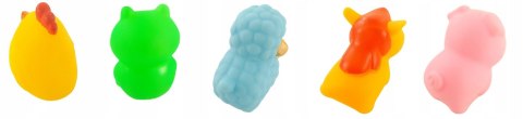 W zestawie znajduje się 5 gumowych zwierzątek: konik, kurczaczek, baranek, świnka i żabka.