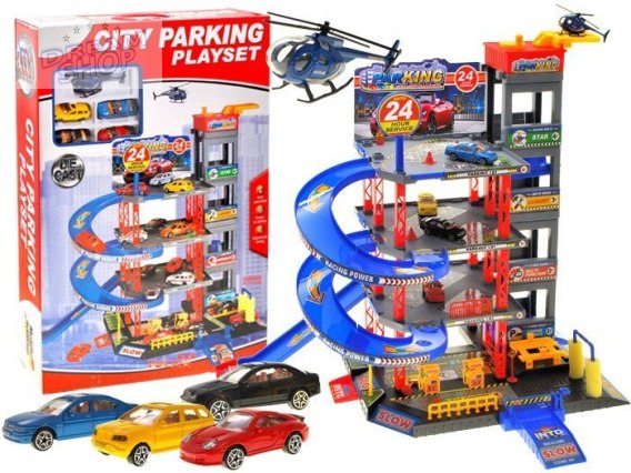 Rewelacyjny wielopoziomowy parking ze stacją benzynową, podnośnikiem, windą, myjnią, warsztatem samochodowym oraz lądowiskiem dla helikoptera. Parking przystosowany jest do "resoraków". Aby wjechać na parking trzeba podnieść rampę. Za pomocą windy autko może przemieszczać się na poszczególne piętra parkingu. Kiedy autko jest brudne koniecznie trzeba pojechać na myjnie samochodową i twoja bryka znów będzie jak nowa. Jeśli brakuje benzyny bez problemu zatankujesz na stacji benzynowej. Gdy chcesz naprawić swój samochód skorzystaj z podnośnika, dzięki któremu naprawisz zawieszenie czy zmienisz oponę. Zestaw zawiera wiele dodatkowych elementów wspaniale urozmaicających zabawę, takich jak znaki drogowe, pachołki.