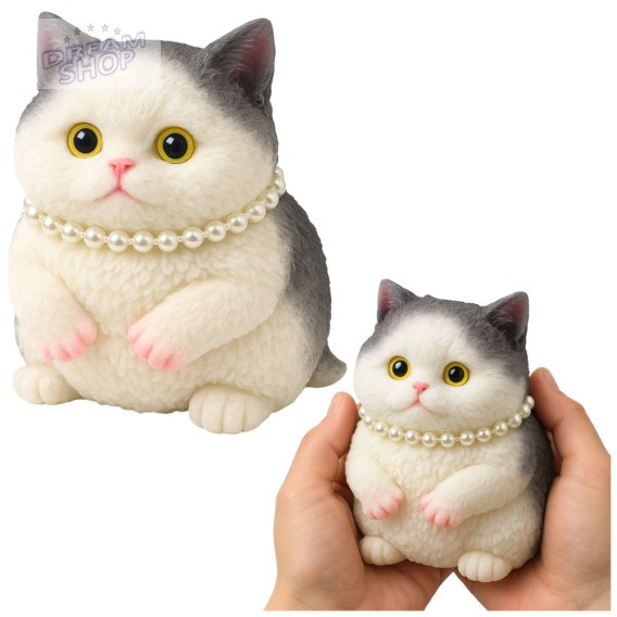 Kotek w perłowym naszyjniku wygląda elegancko i słodko zarazem, dlatego sprawdzi się nie tylko jako gniotek antystresowy, ale również jako ozdobny gadżet na biurku czy półce. Doskonale nadaje się do redukcji stresu, zabawy i ćwiczeń dłoni - dla dzieci i dorosłych.