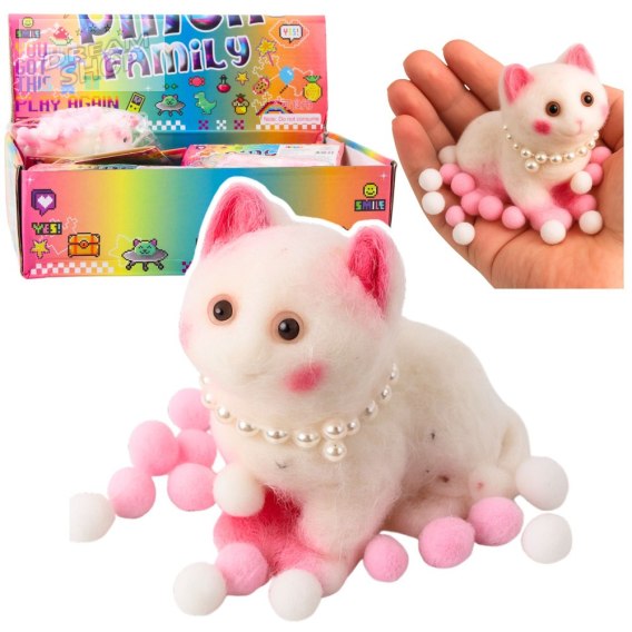 Kotek został wykonany z dbałością o szczegóły. Jego powierzchnia pokryta jest imitacją miękkiego futerka, co nadaje mu wyjątkowy, realistyczny wygląd. Dodatkową ozdobą są biało-różowe pomponiki, które dodają zabawce uroku i delikatności. Całość uzupełnia perłowy naszyjnik, dzięki któremu gniotek wygląda elegancko i wyjątkowo.