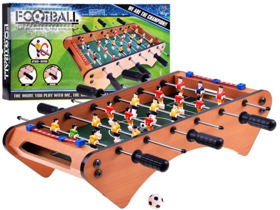 Znana gra piłkarzyki na drewnianym stole wersja klasyczna w miniaturowym wydaniu. Prawdziwy turniej piłkarski we własnym domu. Zapewni wiele emocji podczas rozgrywanego meczu. 2 drużyny w każdej po 9 graczy rozbudzą niemałe emocje w każdym fanie piłki nożnej. W rozgrywce mogą brać udział co przynajmniej 2 osoby, można zaprosić do udziału w grze kibiców. Gra się przesuwając piłkarzyki i obracając za pomocą rączek wystających z boku stołu. Piłkarze umieszczeni są po 3 na metalowych prętach jak w klasycznym stole do gry. Stół wykonany jest z drewna. Piłkarze, piłki oraz pozostałe elementy są wykonane z plastiku.