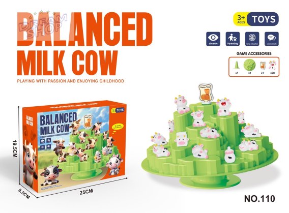 Gra zręcznościowa balansujące krowy dla dzieci trzeciego roku życia. Zabawna gra pomoże w rozwoju zręczności i koordynacji ruchowo-wzrokowej. Zestaw wykonano z najlepszej jakości materiałów w żywych kolorach. Zabawa polega na umieszczaniu na balansującym drzewku figurek krówek, kartoników z mlekiem czy butelek, tak by zachowało równowagę i żaden element nie spadł. W zestawie znajduje się 16 figurek krówek, 4 figurki kartoników z mlekiem, 4 butelki, drzewko z podstawką oraz tabliczka z Happy Time.