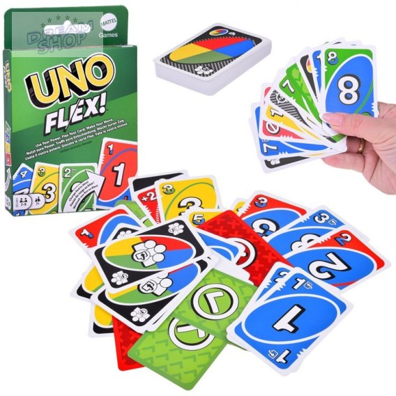 UNO Flex to nowa wersja uwielbianej przez wszystkich gry karcianej. Gra zwiera dodatkowo karty „Akcji" i „Zmiany", które pozwalają na zmianę koloru oraz niektórych zasad gry, dodając grze jeszcze więcej zwrotów akcji a rozgrywka staje się ciekawsza i bardziej nieprzewidywalna. Karty specjalne pozwolą graczom na zmianę koloru według uznania np. zielona 2 w mig może stać się czerwoną 2. Karty „Zmiany", które pozwalają graczom zmieniać kolor kart lub zasady kart specjalnych. Karta „Akcji" umożliwia graczowi zmianę - jeśli ma zielony ptaszek; a jeśli ma czerwony X oznacza to, że gracz musi poczekać. Standardowa Karta „Weź dwie" działa normalnie, ale jej wersja Zmiany wymusza na wszystkich pozostałych graczach dobranie 1 karty! Karta Zmiany „Weź cztery" pozwala zdecydować, który gracz ma dobrać 4 karty. Dzika karta Zmiany „Wszyscy biorą karty" zmusza wszystkich pozostałych graczy do dobrania 2 kart, a Karta Zmiany „Postój" pozwala pominąć wszystkich graczy.